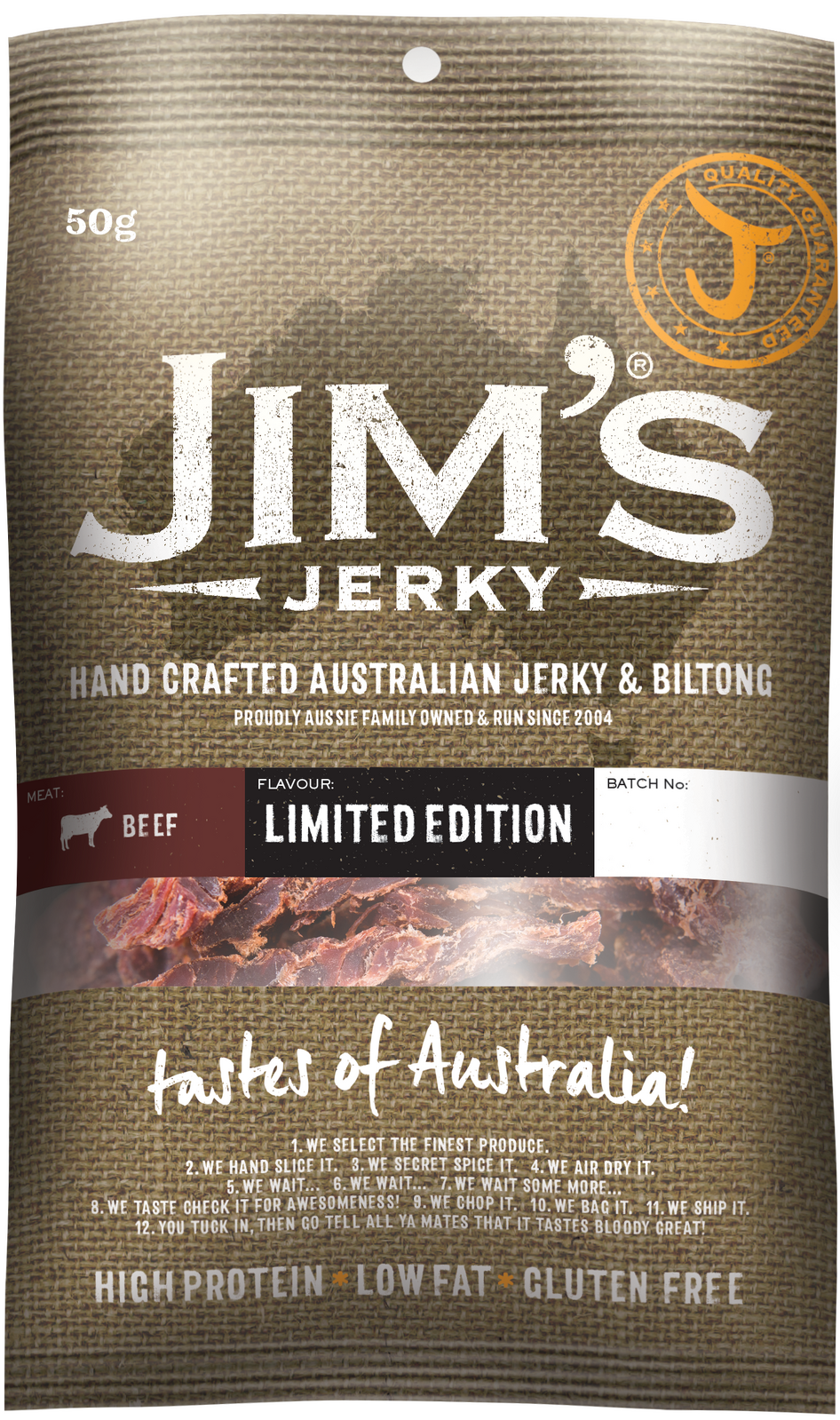 Topside Beef minus The Fat + Yummy Spices + 24 Hours Drying on a Rack = Jim's Awesome Beef Jerky. Sliced and bagged for your convenience.