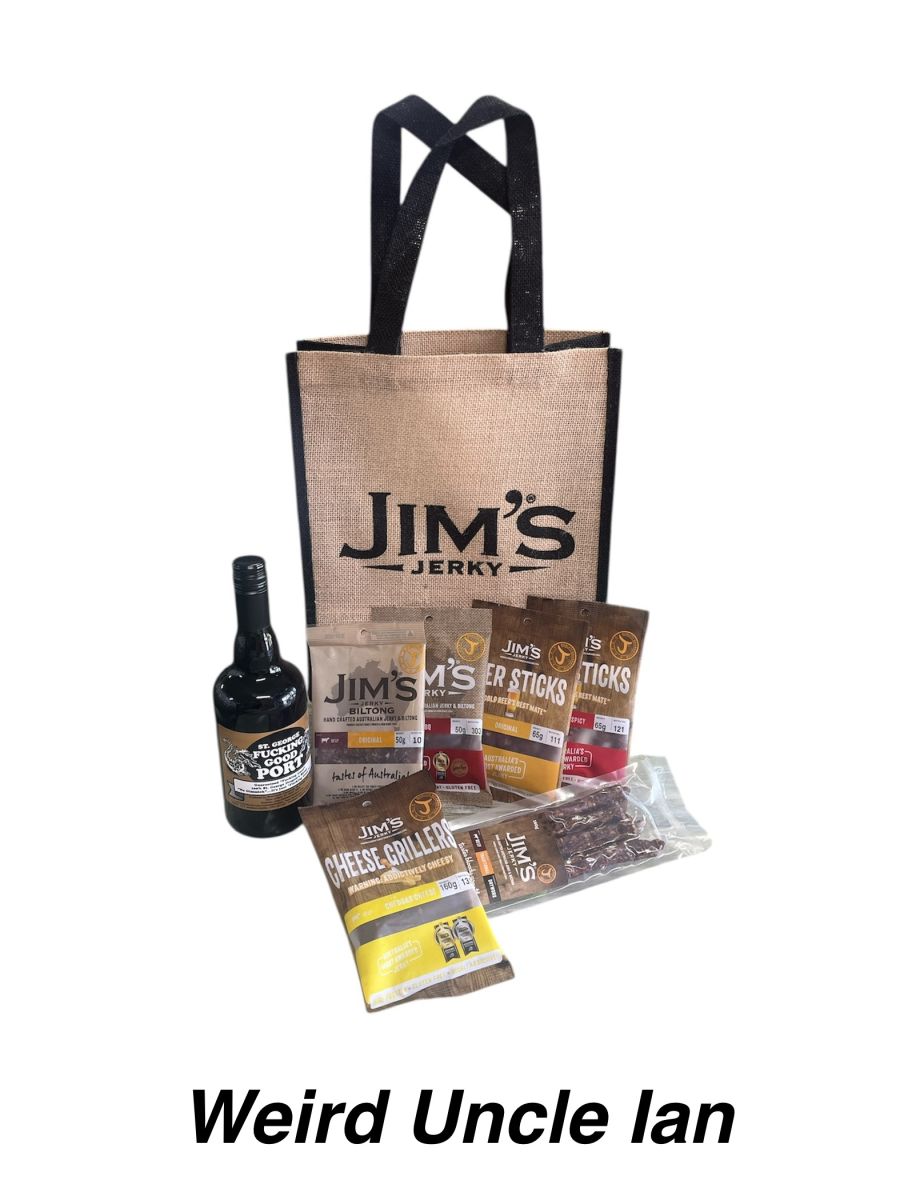 Let’s not deny it, we all have our version of the weird uncle. We like to call him Ian. And there usually isn’t a boring conversation to be had while Weird Uncle Ian is around. We’re celebrating him with a carefully selected range of our famous biltong, jerky, drywors and grillers. Something in there to please even the weirdest you can think of! But if that fails, we’ve added a bottle of Riversands F@cking Good Port - cos no one can deny that. All packed in our Jim’s Jerky jute tote bag, it’ll make even weird people...a little less weird.